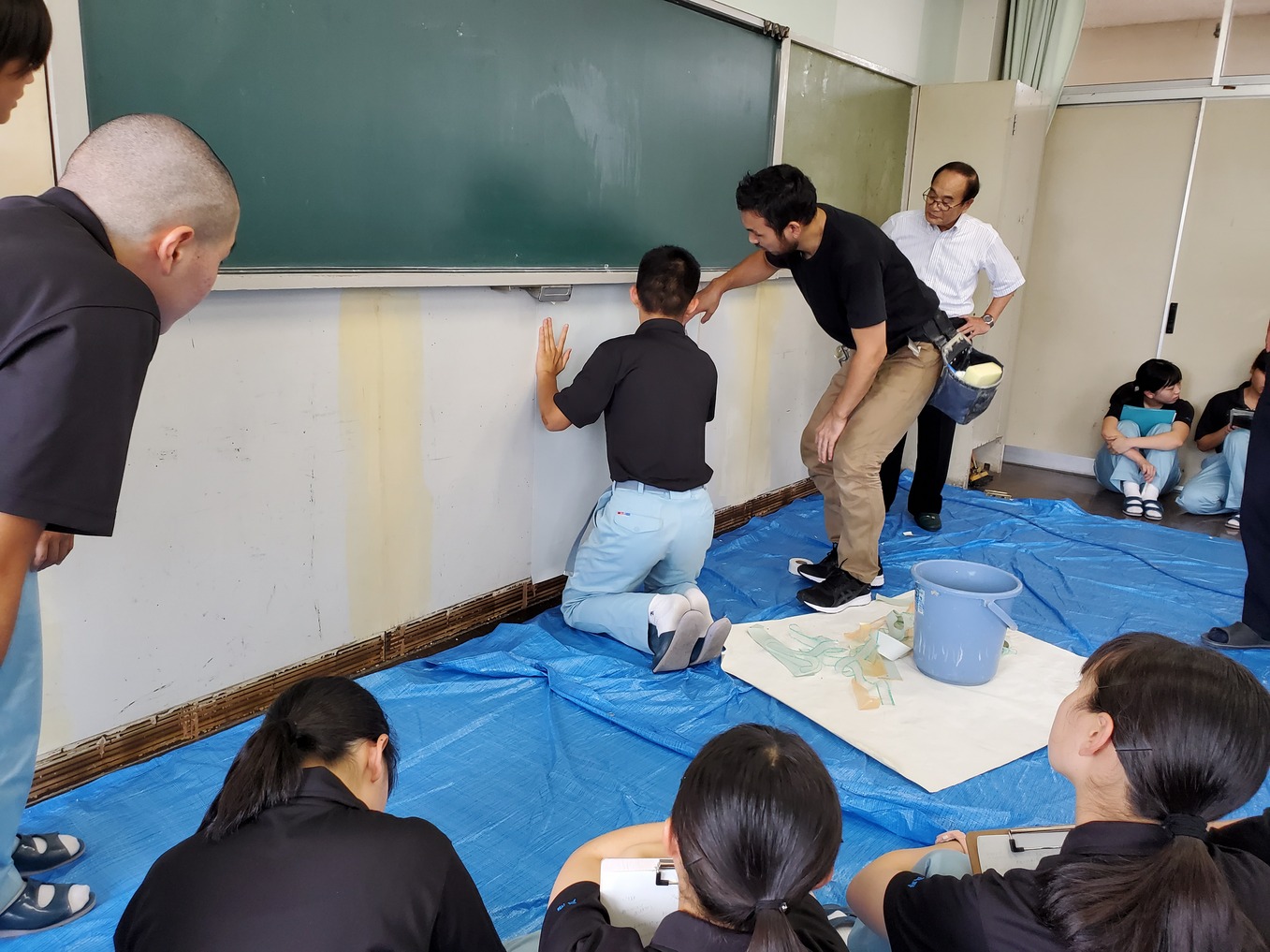 3回目となる今回は、インテリア科の教室の壁紙張替え作業を行い、生徒にも実際に施工体験をしてもらいました。